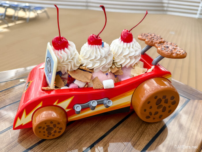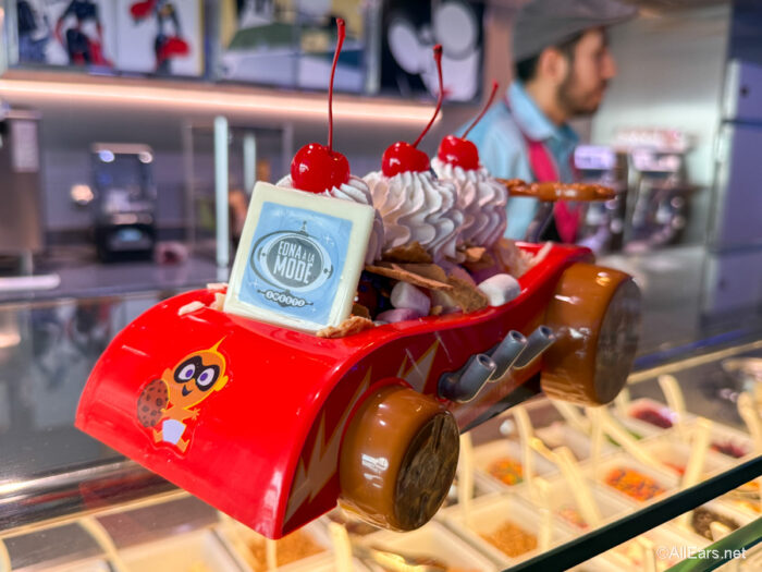 There’s one treat here, though, that we had to try: the Signature Sundae for $12.75. It’s three scoops of ice cream (your choice), five toppings (again, your choice), whipped cream, and a cherry served in a take home souvenir Incredibles car that has wheels that look like cookies.