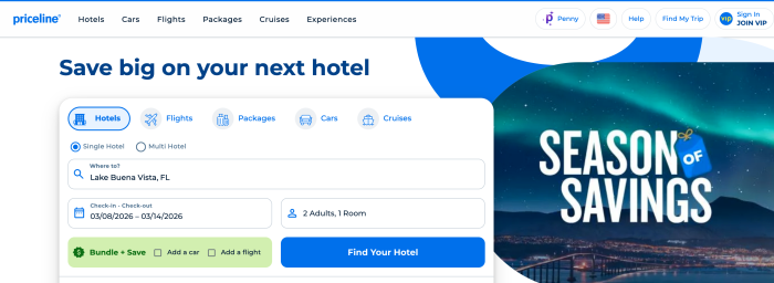 This may seem simple, but it matters. Priceline uses the guest count to filter out hotels that can’t accommodate your party. If you undercount or overcount guests, potential hidden deals, including Disney resorts, may disappear entirely. Input your exact travel party numbers before moving on.