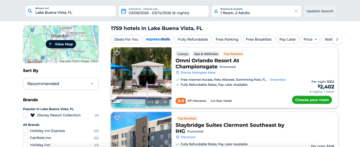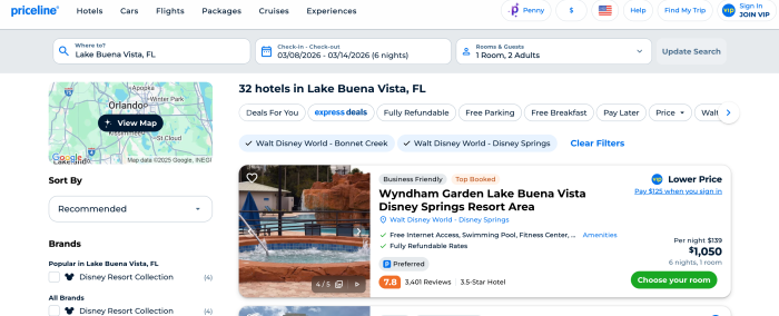 Your starting point matters. When entering your destination, type “Lake Buena Vista, FL” into Priceline’s search bar. While “Orlando” will work, Lake Buena Vista consistently yields the most accurate Disney-area options, since it covers most of the neighborhoods immediately surrounding Disney property.