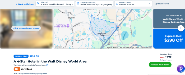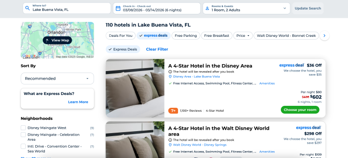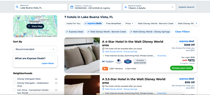 Once your dates and destination are set, click “Find Your Hotel” and then turn on the “Express Deals” filter. Express Deals hide the hotel name until after your purchase but show you the star rating, review count, amenities, and location. This hidden-name model is what allows you to snag deep discounts on rooms that normally cost far more, sometimes including Disney-owned resorts.