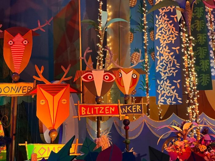 Wreaths and elves and seasonal signage hang from the ceiling for the duration of the ride, while classic holiday songs – including “Deck the Halls” and “Jingle Bells” – are intertwined with the iconic it’s a small world theme.