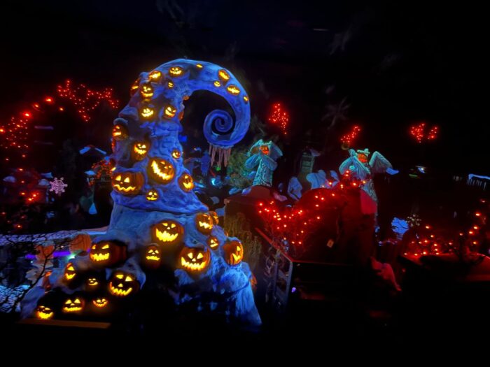 The Haunted Mansion in New Orleans Square takes on an entirely different persona with its Nightmare Before Christmas overlay. Many of the 999 happy haunts step aside to make room for the likes of Jack Skellington, Oogie Boogie, Sally and the dog Zero.