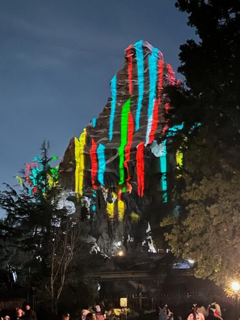 During Disneyland’s night-time holiday-themed parade, majestic Matterhorn Mountain is transformed into an artist’s palette of color as holiday-themed projections are splashed onto the side of the peak.