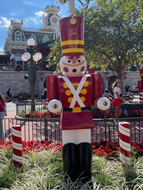 A massive Christmas tree, guarded by six-foot tall wooden soldier nutcrackers, adorns Town Square, and Main Street USA is all decked out with boughs of holly and assorted other holiday accoutrements.