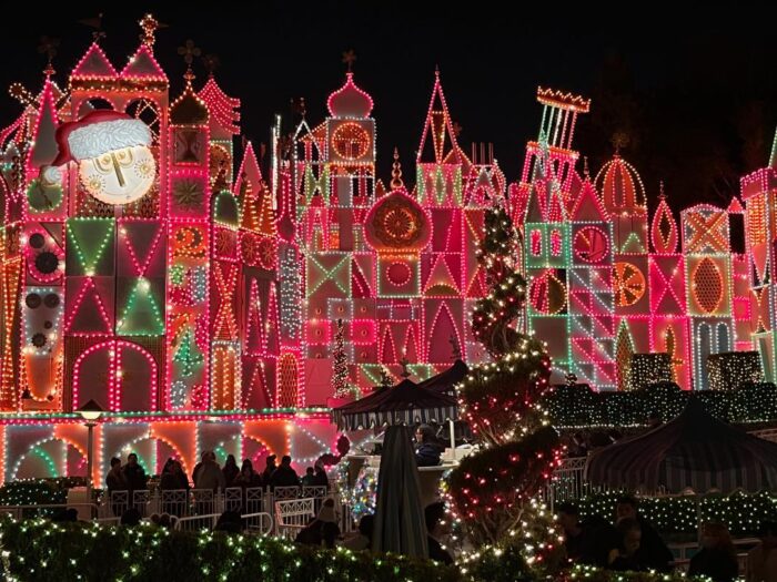 Over in Fantasyland, it’s a small world’s overlay is spectacular. As guests approach the attraction, they are blown away by the fantastic light display that adorns the exterior of the show building and the surrounding landscape.