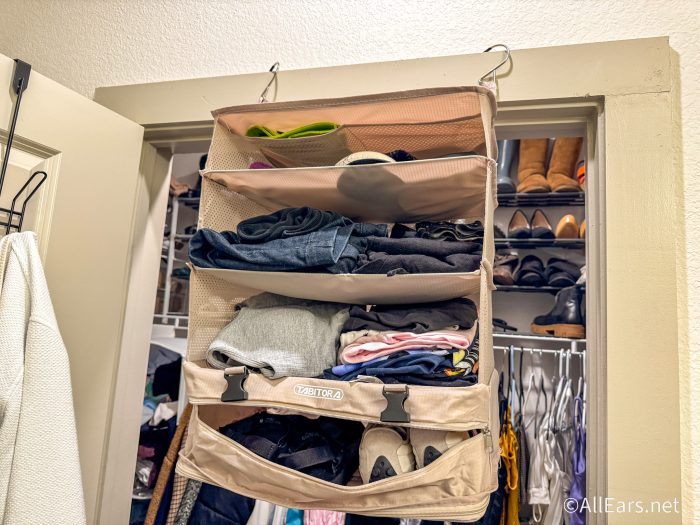 This thing is pure genius. The TABITORA Hanging Travel Shelves are like a portable dresser that collapses neatly into your suitcase. When you arrive, you just pull it out and hang it in the closet with no need to unpack item by item. I fit an entire week’s worth of clothes, two pairs of shoes, a sweatshirt, and even a couple of pairs of Minnie ears into this thing.