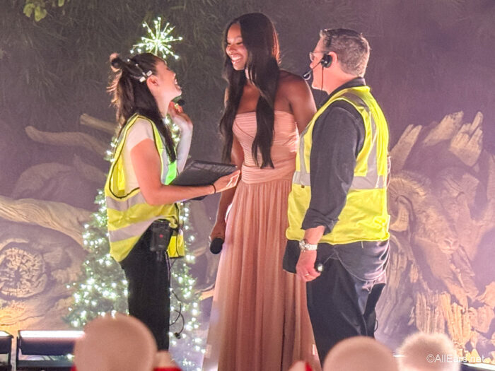 On the second night, we headed to Disney’s Animal Kingdom at around 3:30 AM. The stage was set up in front of the Tree of Life, and a choir was rehearsing “Silent Night” with a stage director in Coco Jones’ place as they ran through it. She came out and sang with the choir, and we learned that one of the choir conductors is from EPCOT’s Candlelight Processional. So cool! Filming went about the same as the previous night.