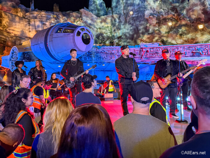 Once everything was in place and the lighting was tested, Good Charlotte came out and rocked Batuu with “Fairytale of New York.” The most interesting part is seeing it all happen. The band was accompanied by three string instruments and two backup vocalists. There were also some cool effects and pyrotechnics during the second take. We even got to be part of the show because the audience was instructed to do certain motions during certain parts of the song.