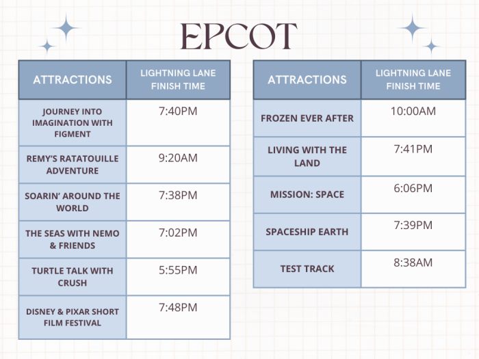 The following is Remy’s Rataouille Adventure as it is gone by 9:20 AM. Both of these are Tier 1 attractions, with Frozen Ever After just behind them at 10 AM. If you have Early Entry, this is a great park to take advantage of it and ride one of these top-tier rides. If you can enter the park for Early Entry using the International Gateway, you’ll be able to head to Remy’s first. If you are using the main gate to enter, Frozen Ever After or Test Track is your best choice.