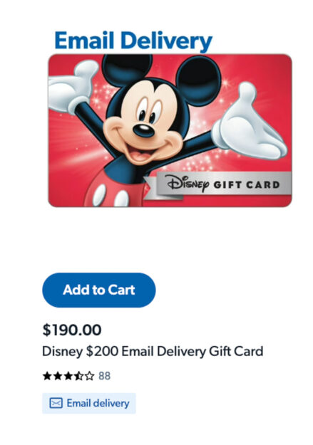 For instance, a $200 Disney Gift Card is available for $190.