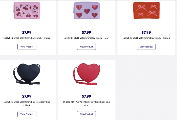 There are two different bags that look like hearts themselves, but also three different styles of clutches themed to Valentine’s Day as well. Adorable, and that price? You can’t beat it!