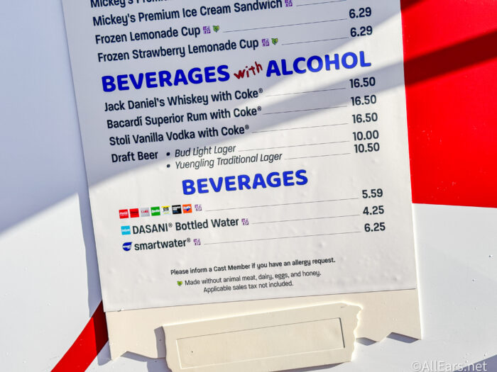 …while also having a variety of sweet options like churros, Mickey’s Premium Ice Cream Bars and Sandwiches, and even a few flavors of frozen lemonade cups! You’ll also have your choice of a fair amount of beverages, including a few with alcohol, like draft beers and frozen concoctions, as well as sodas or bottled water.