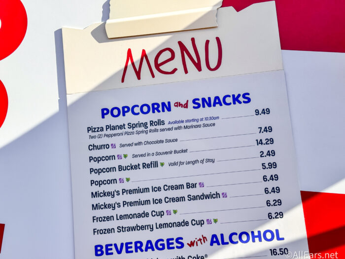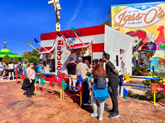 The snack stand named Popcorn and Snacks is a popcorn box that has somehow tipped over in Andy’s backyard (we love how it fits the Toy Story Land theming). It’s got a little window propped open with toothpicks. And it seems the crowds are already flocking to be some of the first to grab a few of the menu items you’ll find here!