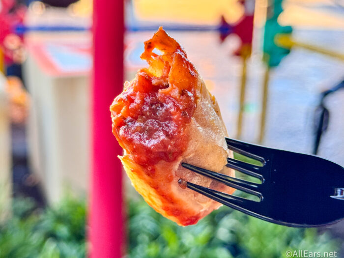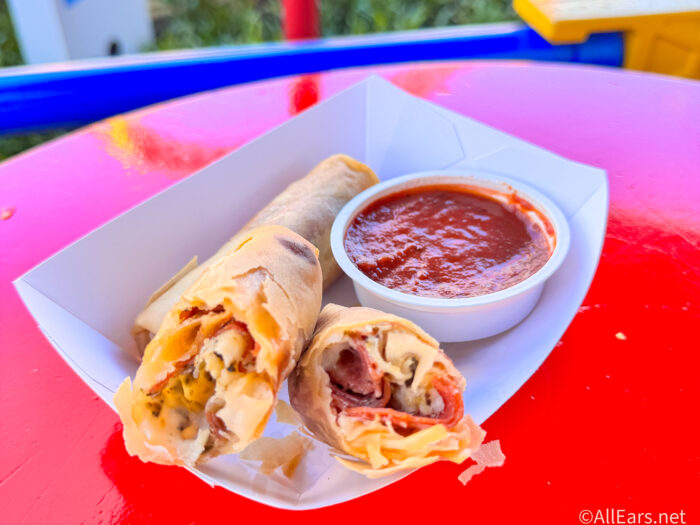 We’re fairly confident they’re the same ones that you’ll find at the Spring Roll cart outside of Adventureland in Magic Kingdom. However, they’re less greasy than the last time we picked up a few in the other location which was a welcomed surprise! We also tasted a few herbs and garlic to pair with the fresh slices and pepperoni and gooey cheese that is packed into the center of each spring roll.