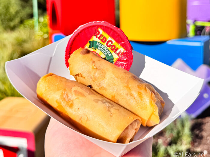 Naturally when we spotted these new spring rolls, we knew the mission ahead of us! So we ordered a set of Pizza Planet Spring Rolls that comes of a set of two for $9.49. These spring rolls are stuffed with pepperoni and cheese (much like a pepperoni pizza) and served with a side of marinara sauce to dip them in.
