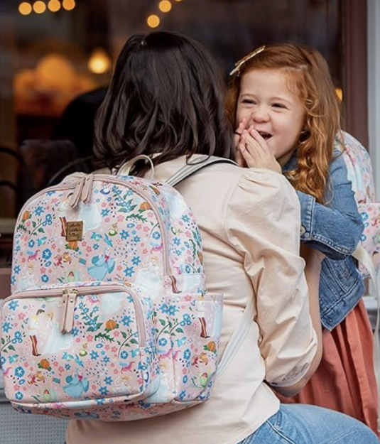 We absolutely adore the pattern on this bag and the color scheme — it’s pink, orange, yellow, with hints of green, and features Mickey and Minnie running around, having a great time. This bag is also fantastic for storage, with two full-size side pockets, a full-size main pocket, and two zippered front pockets. You’ll be able to fit all you need for your park day, and then some!