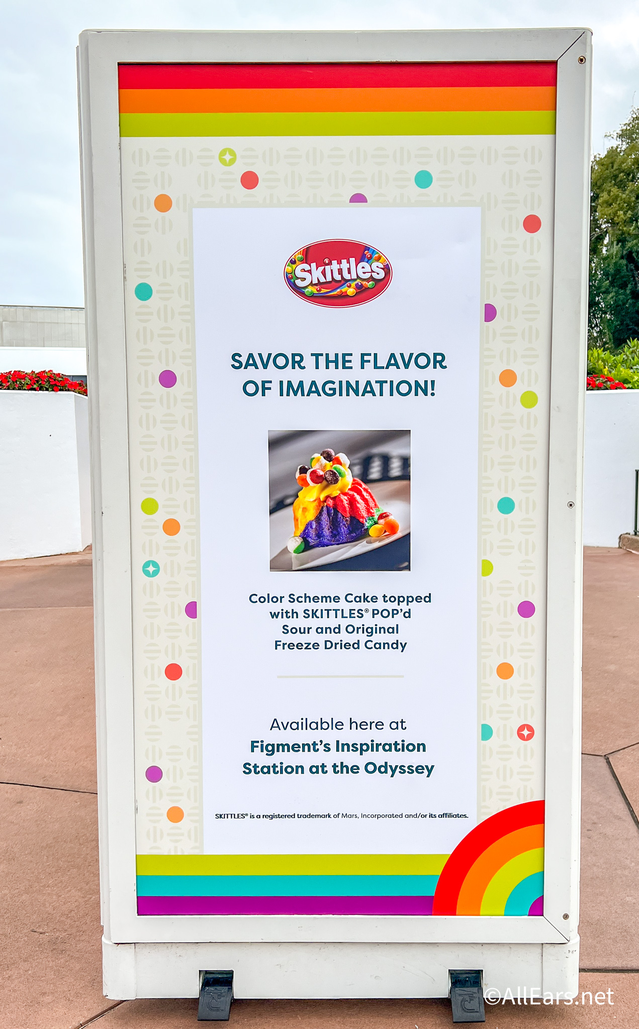 - Color Scheme Cake (Wonderful Walk of Colorful Cuisine) — Fruit-flavored Rainbow-hued Cake topped with SKITTLES® POP’d Sour and Original and Sour Freeze Dried Candy, $5.29