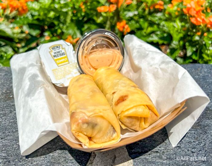 Let’s talk lunch and dinner. If you’re looking for something light, there are plenty of snacks offered around the resort that will satiate a small appetite. With that in mind, if you’re looking for something unique, we recommend the Cheeseburger Spring Rolls from the Spring Roll Cart in Magic Kingdom! These little guys cost $9.50 and are a big hit with the AllEars team! They taste just like a cheeseburger and come with a dipping sauce similar to a Big Mac sauce.