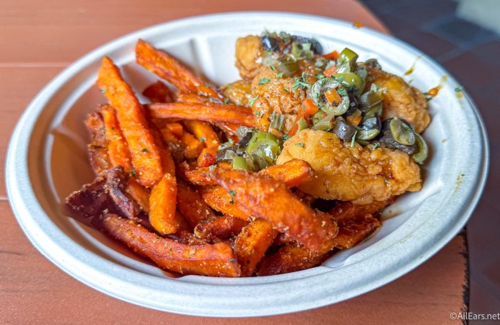 Back at Magic Kingdom, fans of chicken can grab the Hot Honey Chicken with Sweet Potato Fries for only $9.99 at Golden Oak Outpost. This yummy entree comes with Chicken Nuggets tossed in Hot Sauce-Honey, served with New Orleans Olive Relish and Cajun-spiced Sweet Potato Fries.