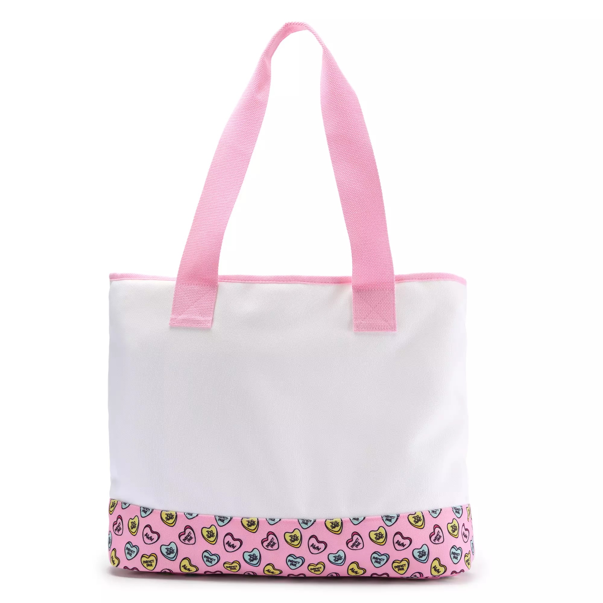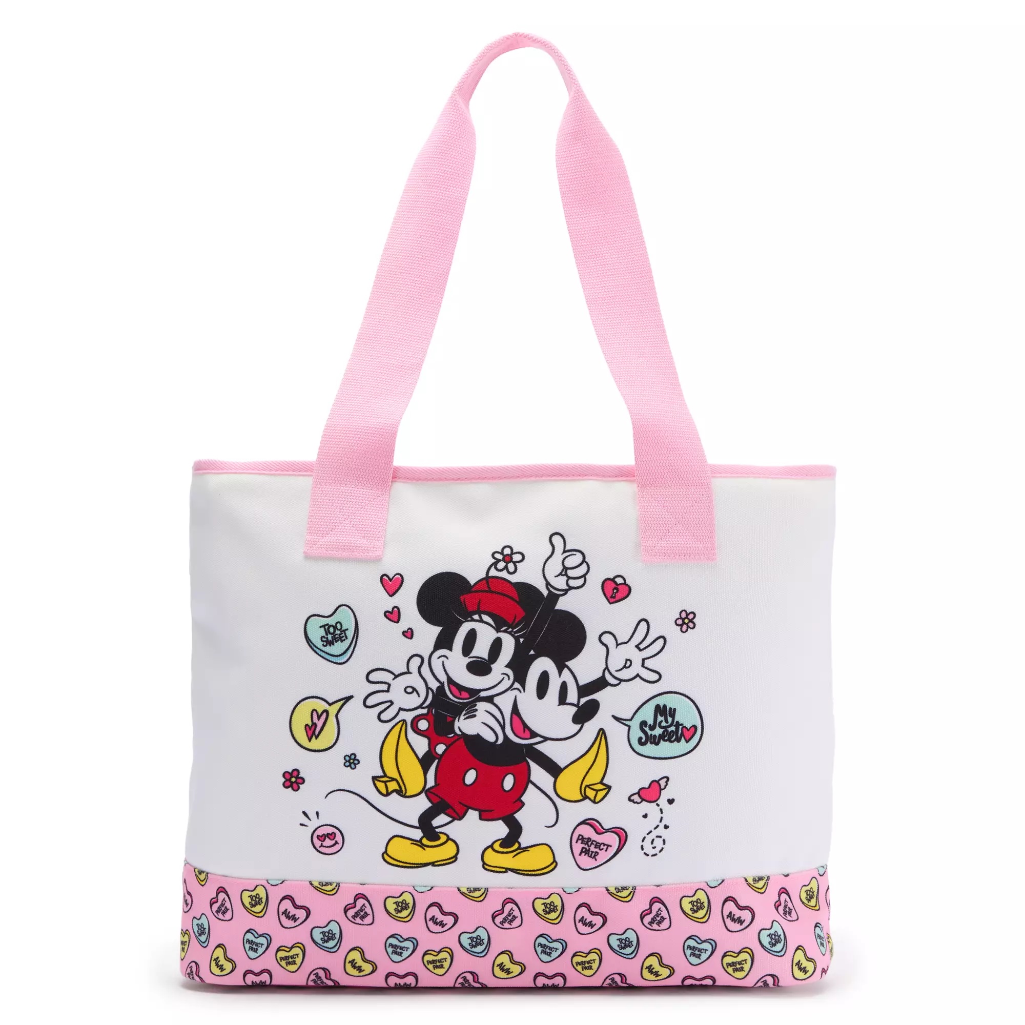 Sweethearts Mickey and Minnie celebrate their affection for each other with this canvas tote covered in colorful Love Hearts candies. ”Perfect Pair,” ”Too Sweet,” and ”Aww” are the romantic messages featured on this spacious and sturdy bag, which will provide a sugar rush!