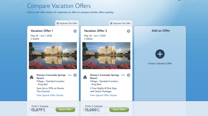 Now that we know what they both entail, which one will actually save you more money? First, that depends on what you mean. Luckily for us, Disney World’s booking website has an amazing Compare Vacation Offers feature. Once you’ve selected a vacation package and get to the total price, you’ll see the option to compare vacation offers, which is where we’re pulling our numbers from.