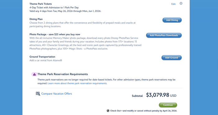 To keep things even, we selected the same hotel, Coronado Springs, with the same room type and dates. The rooms we selected were for May 26th until June 1st, with no add-on extras like the dining plan or photo package. For the 30% off deal, the total was $3,079.98 for a Village Standard Location with a King Bed and 4 days of park tickets.