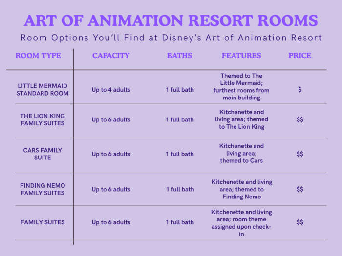 I would set the Art of Animation Resort rooms somewhere between Moderate and Value Resorts in terms of price. This resort is known for its themed suites. This hotel is a favorite for kids because of its Disney theming with large characters outside of the buildings and incredible details inside the rooms. These are a good choice for a family of 6 that doesn’t fit into a traditional hotel room made for 4 people.