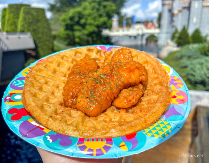 Starting in the OG Disney World park, we’re headed to Sleepy Hollow in Magic Kingdom for the Sweet & Spicy Chicken Waffle. It used to come with a broccoli slaw on top, but now it’s just topped with parsley flakes. Despite being picky, spicy food is my kryptonite!