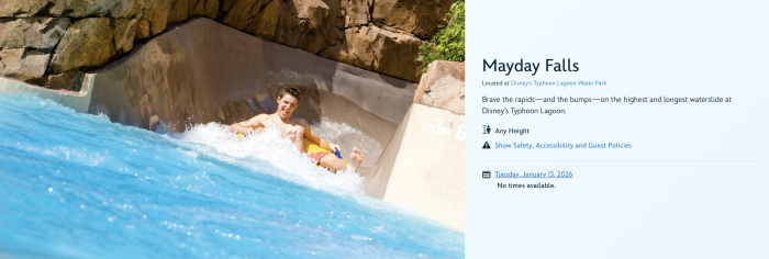 If you’re heading to Typhoon Lagoon in the near future, this closure is something to plan around. While the park still offers plenty of water-park thrills, from Crush ’n’ Gusher’s exciting high-speed drops to the relaxing Lazy River and wave pool, losing one of its big raft rides changes the day’s pacing a bit. If Mayday Falls was going to be a highlight for your group, you may want to shift your itinerary toward other slides or grab extra time in open rides.