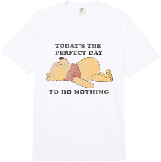 If you’re ready to fully embrace the cozy vibes, this Winnie the Pooh shirt is pure comfort energy! It features Winnie the Pooh in full relaxation mode with the very relatable reminder that today is the perfect day to do nothing. It’s sweet, nostalgic, and ideal for laid-back park days, resort lounging, or anyone who believes rest is the vibe.
