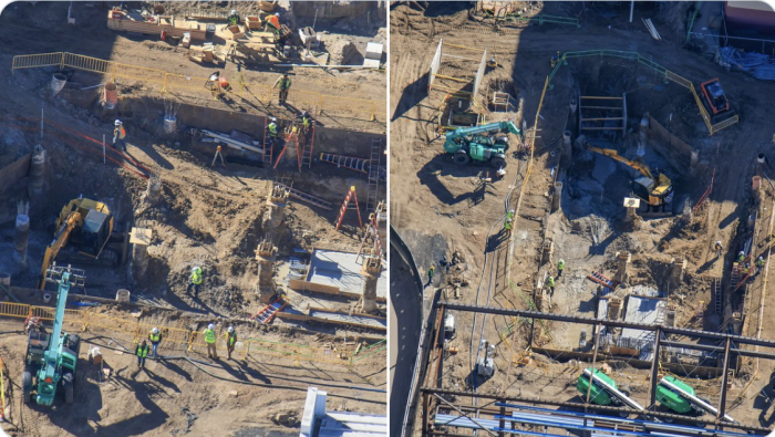 Recent photos show cleared land, construction equipment, and early groundwork (including what appears to be foundational work and footers in place) in the area where Rip Ride Rockit once stood, as well as surrounding backstage zones near the park’s New York area — including what looks to be the framework for a roller coaster’s loading building.