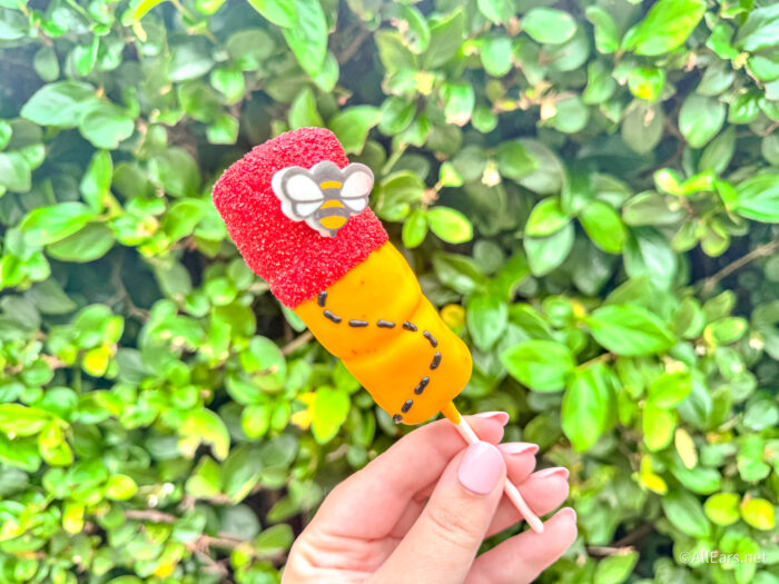 As for the Pooh Marshmallow Wand, it’s the same idea, marshmallows covered in white chocolate, but the yellow dye used here doesn’t have as strong as a flavor, so it tastes a bit more bland. However, we could very much taste the red dye used at the top of the treat, so if that will throw you off, this one won’t be the one for you. While we did enjoy the texture of the little sprinkles on top, we don’t recommend eating the fondant bee, because it was totally rock solid.