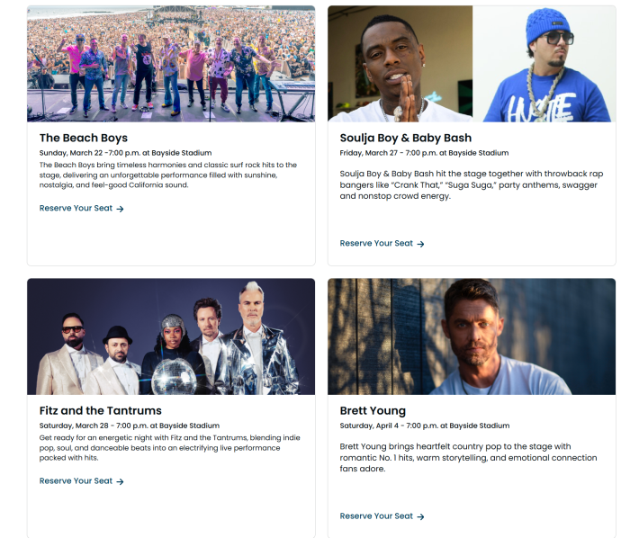 They take place every weekend at the Bayside Stadium where you can enjoy the 60 to 75 minute concerts with artists froma cross genrations and musical styles. They even perform rain or shine!