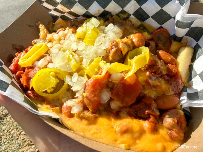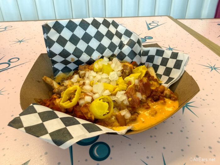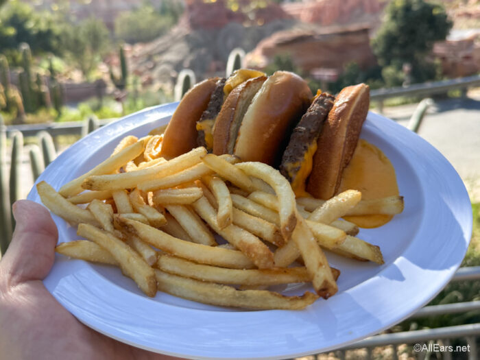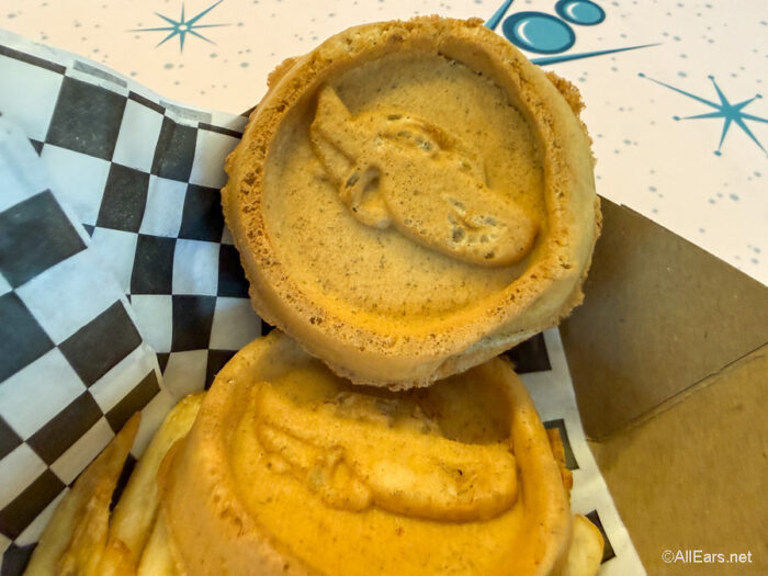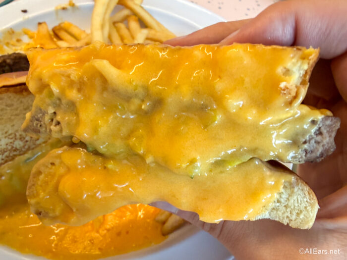 But we have to go back to that pepperoncini cheese sauce. It is spicy (more like Disney spicy, though), and our favorite thing was dipping the burger in that. This is a rare Disney burger that doesn’t need ketchup or mustard because its flavors are already so full.
