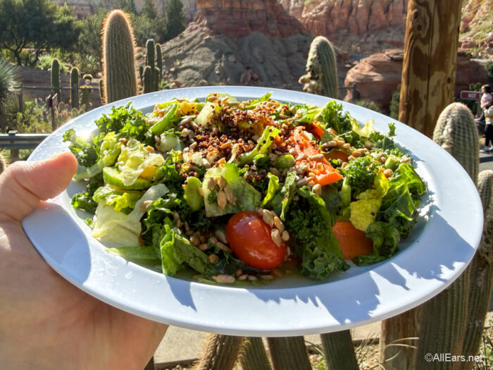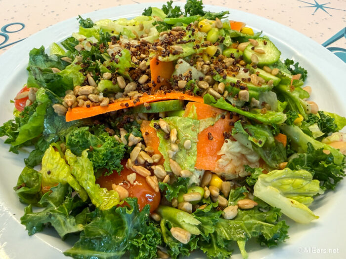 This is what we would call the perfect summer salad. The dressing has a light citrus flavor that brings out the flavors of everything else. The sunflower seeds and quinoa add crunch and earthy flavors, while the beans make it more hearty. The other veggies are nice and fresh. This is a great respite if you’re looking for a break from typical theme park food. It also might just be our favorite healthy option in Disneyland.
