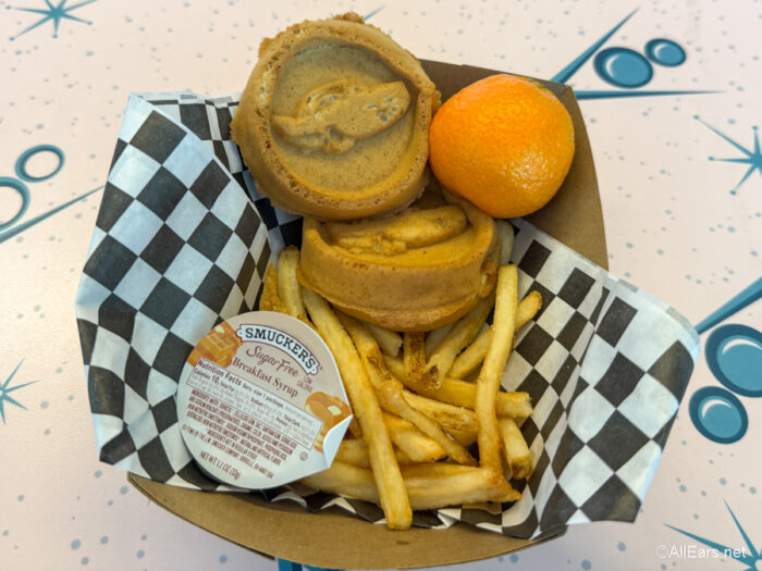 These waffles didn’t have a buttermilk flavor, but they have a slight vanilla flavor once you pour the syrup on. These are classic Disney character waffles. They come with fries, but the Disney Check Meal also includes a cute and water. We’d say this might be a bit overpriced, but if you’re looking for something kids are going to eat, this is a solid option.