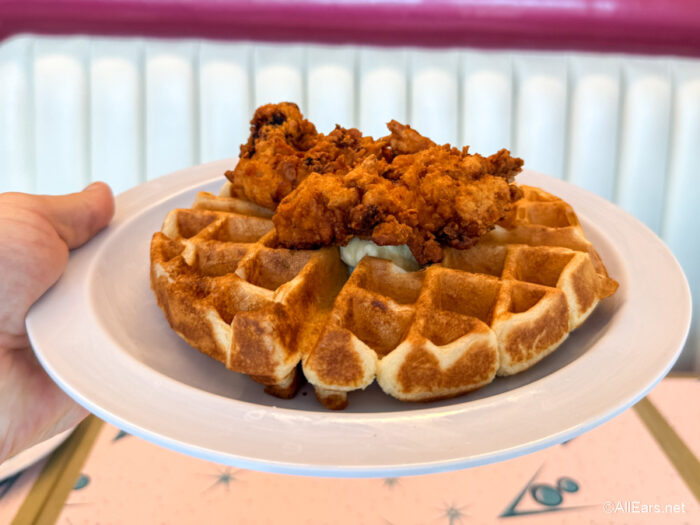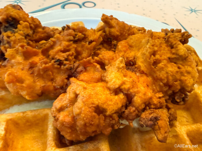 Next up is the Winner’s Circle Chicken and Waffle for $17.49. You get a crispy, golden-fried chicken and a buttermilk waffle with whipped butter and maple syrup. This is a filling meal. The buttermilk waffle is good, but it’s a pretty standard Disneyland quick-service waffle.