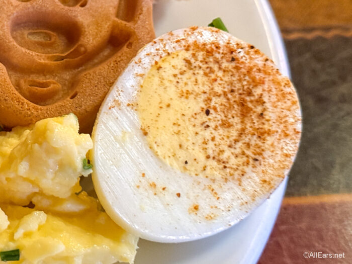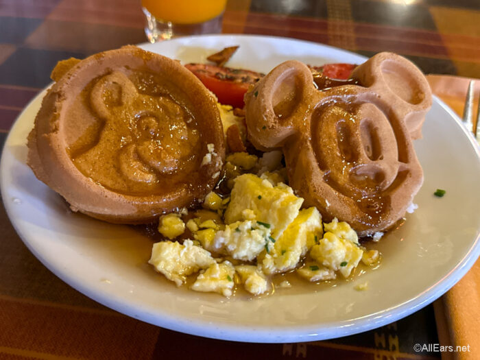 Let’s talk about the food. We’ll start with the bacon, which is crispy, juicy, and perfectly cooked. It’s also not super fatty, which we appreciated. The eggs are also good and have some nice seasoning to them. The Mickey and Simba waffles are those classic Disney waffles you love, but the Simba ones are a lot of fun. Quick note, though: you can’t get syrup at the buffet, but it’s brought to the table. The roasted tomato halves were nice and juicy and rich with flavor.