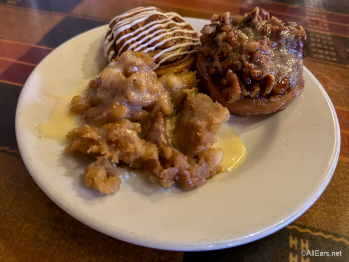 You can’t have breakfast without pastries, so we picked up a few, including a cinnamon roll. This is the usual cinnamon roll you can pick up at just about any Disney World buffet, but it’s tasty. There’s also a sticky bun that reminded us of if a cinnamon roll had married the ooey gooey toffee cake at Liberty Tree Tavern. It had a really nice toffee flavor, but also had this lovely praline pecan topping. Finally, we got some bread pudding with a nice vanilla sauce on top. The bread pudding is dry by itself, but the sauce gives it that moisture and extra sweetness.