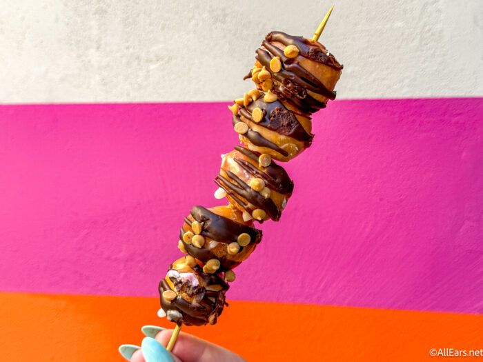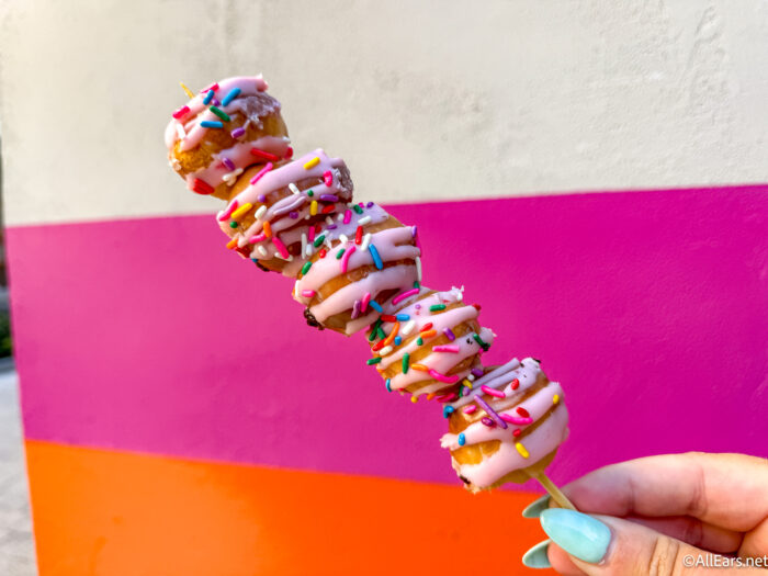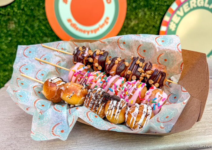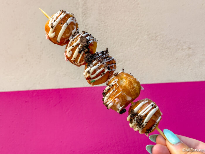 The new Donut Hole Skewers come on a skewer of 5 for $5. The current flavors are Cookies & Cream, Strawberry Sprinkles, and Chocolate & Peanut Butter Chips, which you can mix and match. They’re Everglazed’s signature glazed donut but as bite-sized donut holes, served on skewers,