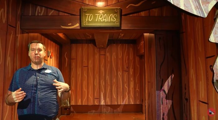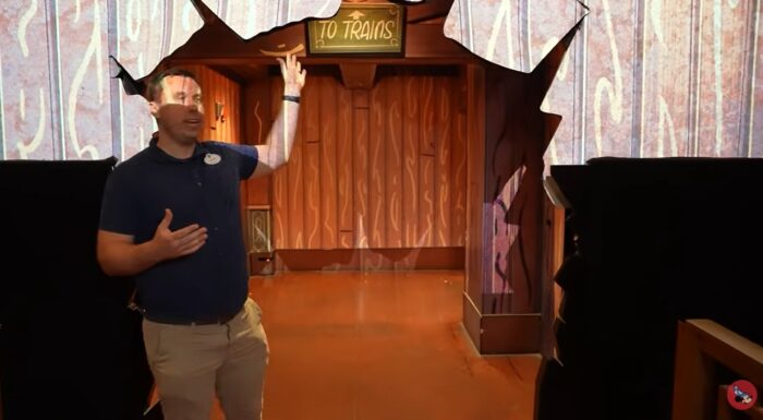 You also see smoke during the pre-show, but there aren’t any visible smoke machines or vents in the theater where smoke could come from. That’s because Disney hid smoke machines behind the “To Trains” sign that you can see as you walk through the screen.