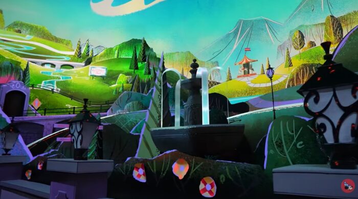 The things that are closer to the ride vehicles are painted set pieces, while the pieces farther away are projections. They also created a daytime scene using blacklight, which is something you don’t see blacklight used for often.