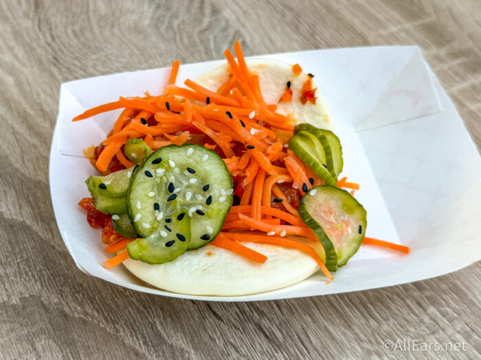 The Kung Pao Bun is also a returning snack. It’s made with plant-based chicken, toasted peanuts, and scallions for $9. We would not have believed this was plant-based had we not known it. The “chicken” has such a good flavor, and then you’ve got the nuttiness from the peanuts (and that’s the big flavor here) plus the tanginess of the scallions.