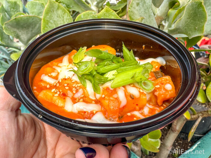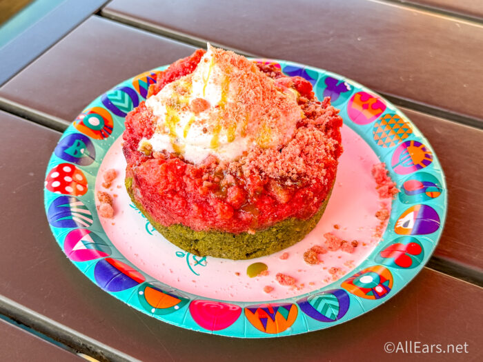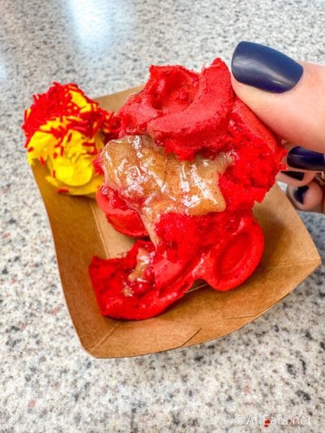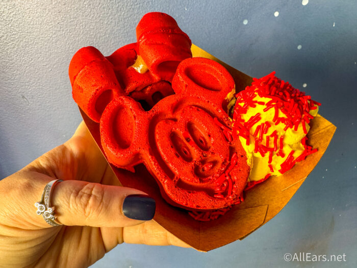The new Hotteok-Inspired Mickey Shaped Waffles are red batter waffles with brown sugar and cinnamon custard, yellow whipped topping, and sprinkles for $11.29. We didn’t really think the yellow whipped topping was necessary, and it stained our hands.