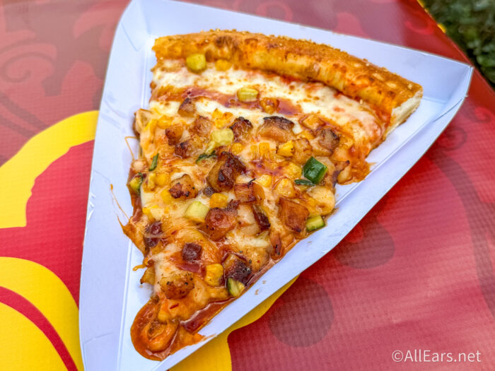 The Korean Pork Belly Pizza is made with roasted soy-glazed pork belly with kimchi cucumber, mozzarella, yellow corn, sesame seeds, and kimchi marinara. You can either get a slice of it or get a whole pizza (for an additional price). It’s got all these flavors: sweet, savory, and cheesy, and they all meld together so well. There isn’t any heat, so you don’t have to worry about that. The pork belly is tender, and you get a lot of it. We also liked the sweetness added by the corn.