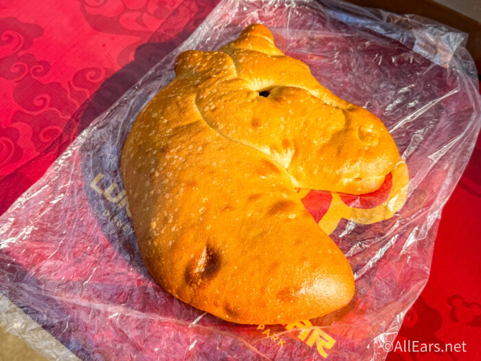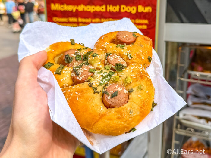 The Mickey-Shaped Hot Dog Bun is $9 and is a returning treat made with classic milk bread with hot dogs, hoisin glaze, parmesan, green onion, and sesame seeds. The milk bread has a light, almost vanilla flavor, but the hoisin adds additional sweetness, as well as saltiness. The hot dog pieces are nice and meaty. The description says it has parmesan, but we couldn’t taste it.
