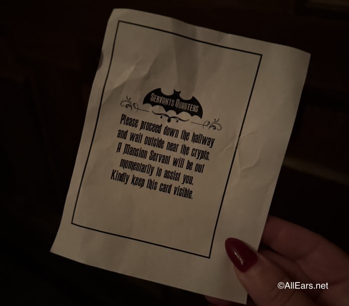 Here’s how it works. When you make your way through the Haunted Mansion queue and reach the very end, right in front of those iconic wooden doors that lead into the pre-show, stop and talk to the Cast Member stationed there. Politely ask if there’s a way to skip the pre-show. If accommodations are available, the Cast Member may hand you a small printed slip that reads “Servants’ Quarters.”