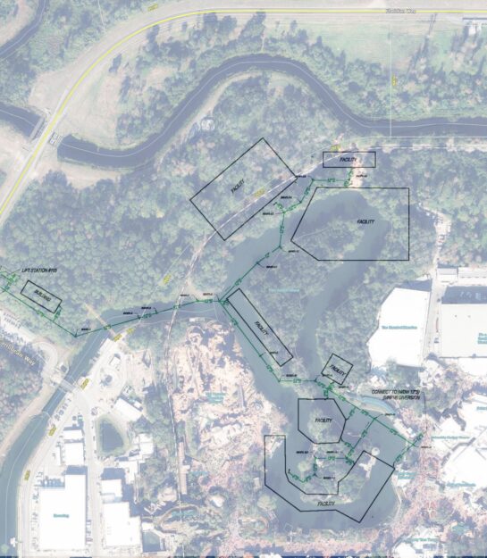 The facility buildings are all connected via utility lines that are marked as either “12”S” or”6″S” with a note that the lines will connect to “(WDW 12″S)(MH#18) DIVERSION”. Based on these documents, it looks like Disney is currently planning to build at least 7 facility buildings to support these new expansions. We also get a look at where some of the main buildings in these expansions are likely to be located in Magic Kingdom.
