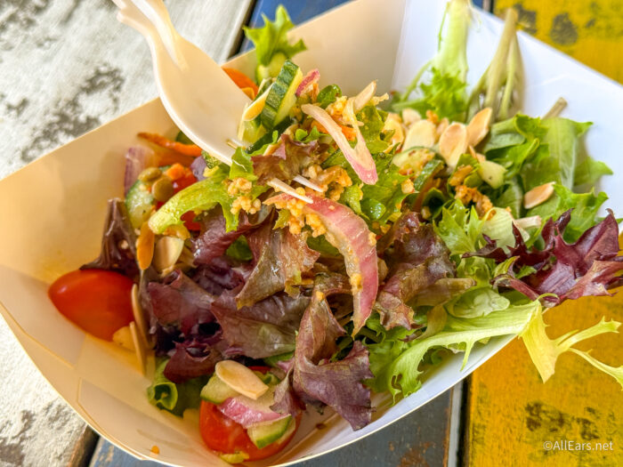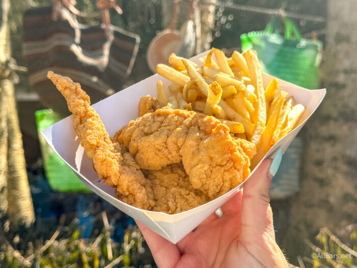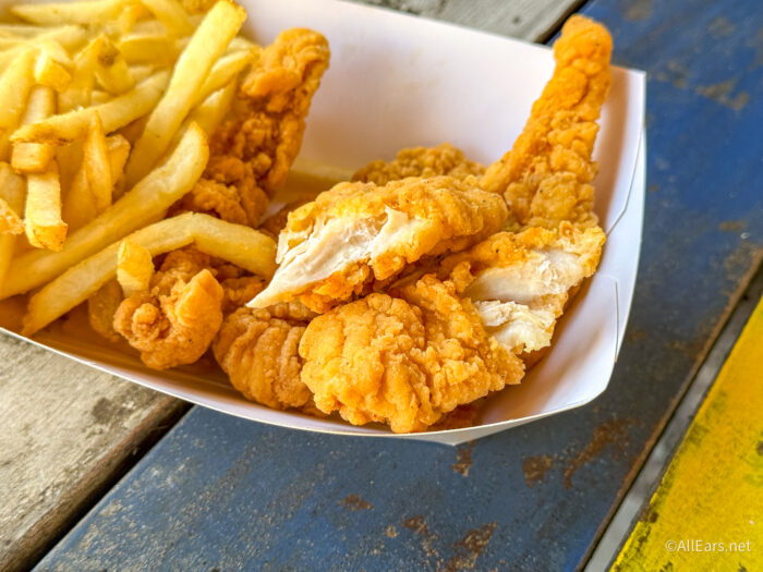 These are your standard Disney World chicken strips — nothing special, but nothing to complain about either. They’re juicy, meaty, and have a nice breading on the outside. The fries were classic Disney World fries as well, but we do recommend grabbing some condiments to make them more exciting, if you’d like. We do LOVE that they’re priced at $10.99, though, because that’s a great deal for a meal!