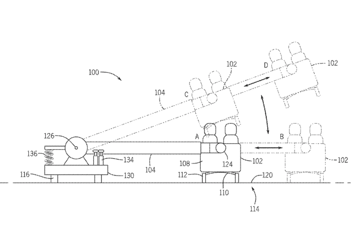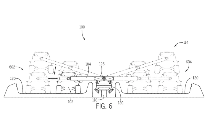 There’s a LOT to break down in this new patent. At its core, this new design has a boom arm that attaches to the ride vehicle via a chassis. As it moves along its track, the boom arm can change where the ride sits on the track — meaning it could move it up and down, side to side, and can even pivot to simulate larger changes.